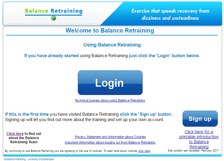 - Balance Retraining Interactive Online Version - visit https://balance.lifeguidehealth.org (external link - this link will take you away from the Meniere's Society website). Click here to find out more about this online resource.