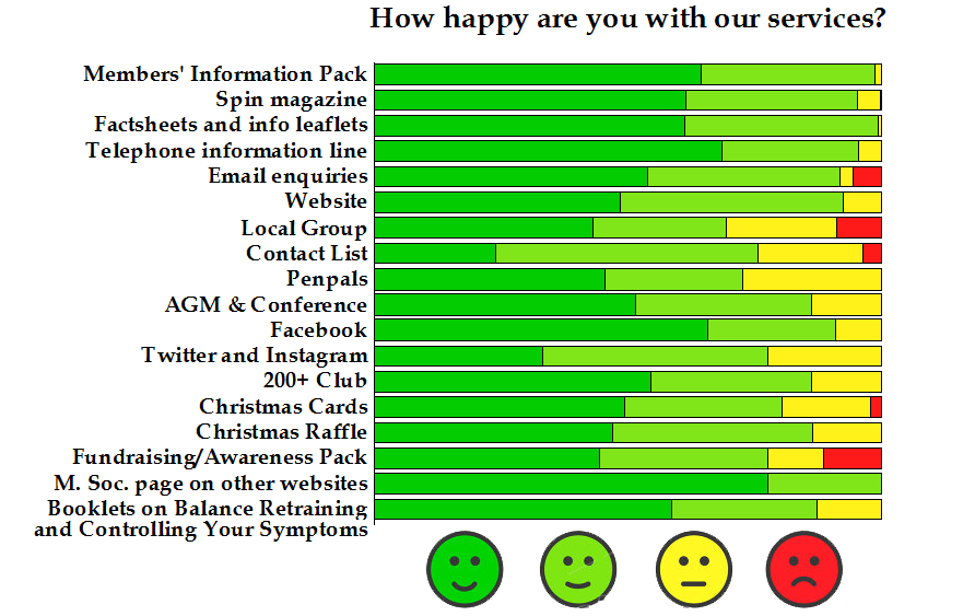 It is probably not surprising that almost all our respondents reported ‘vertigo’, ‘tinnitus’, ‘hearing loss’, and ‘balance problems’. More than half reported ‘aural fullness’, but about a quarter had migraine, and a similar number reported ‘drop attacks’. The Society thus is fulfilling its objectives to support and assist sufferers from these conditions, and we appear successful in this so please ‘spread the word’.
